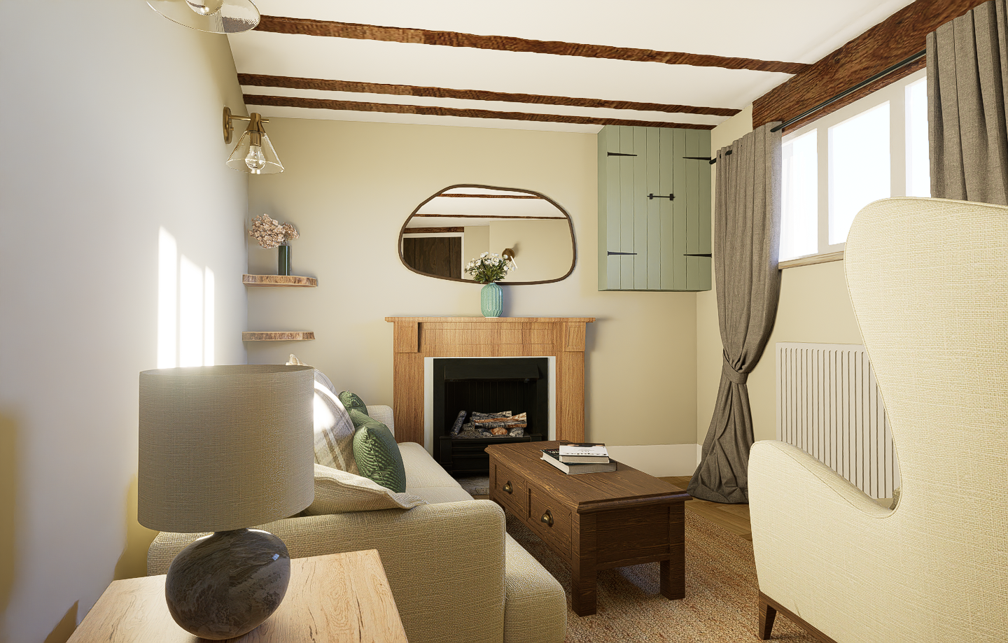 At Brown Cow Cottage, the existing living space was rich with character — exposed beams, deep window reveals and original stonework — but lacked cohesion and warmth. Through CGI, we carefully reimagined the room, balancing its historic features with a softer, more liveable scheme.
